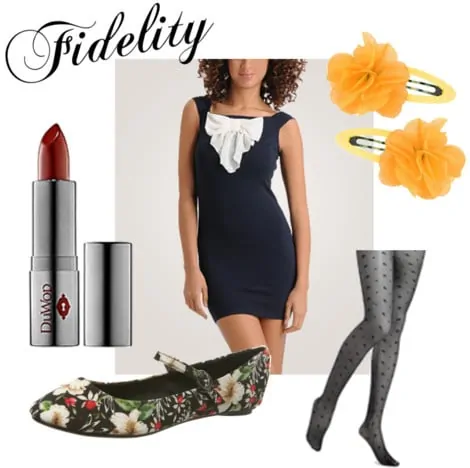 This outfit is inspired by Regina’s love of black. She makes this basic shade anything but boring, however, by picking pieces with unique details, cuts, or shine. Keep the look fun by adding some colorful accessories, like printed mary-janes and floral hair clips (a Regina fave). And, of course, do not forget the final touch- a great shade of red lipstick! This genius lipstick by DuWop changes colors to adjust to the red shade that’s perfect for you!
