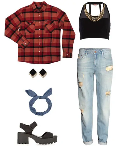 Whoever wears this outfit is both unstoppable and fierce. The bold red flannel gives off a strong and powerful vibe, but the feminine accessories make this look perfect for a woman ready to make a point. Chunky heels and a vintage-style headband are a nod to the ’80s theme, while distressed boyfriend jeans keep things current and comfy.