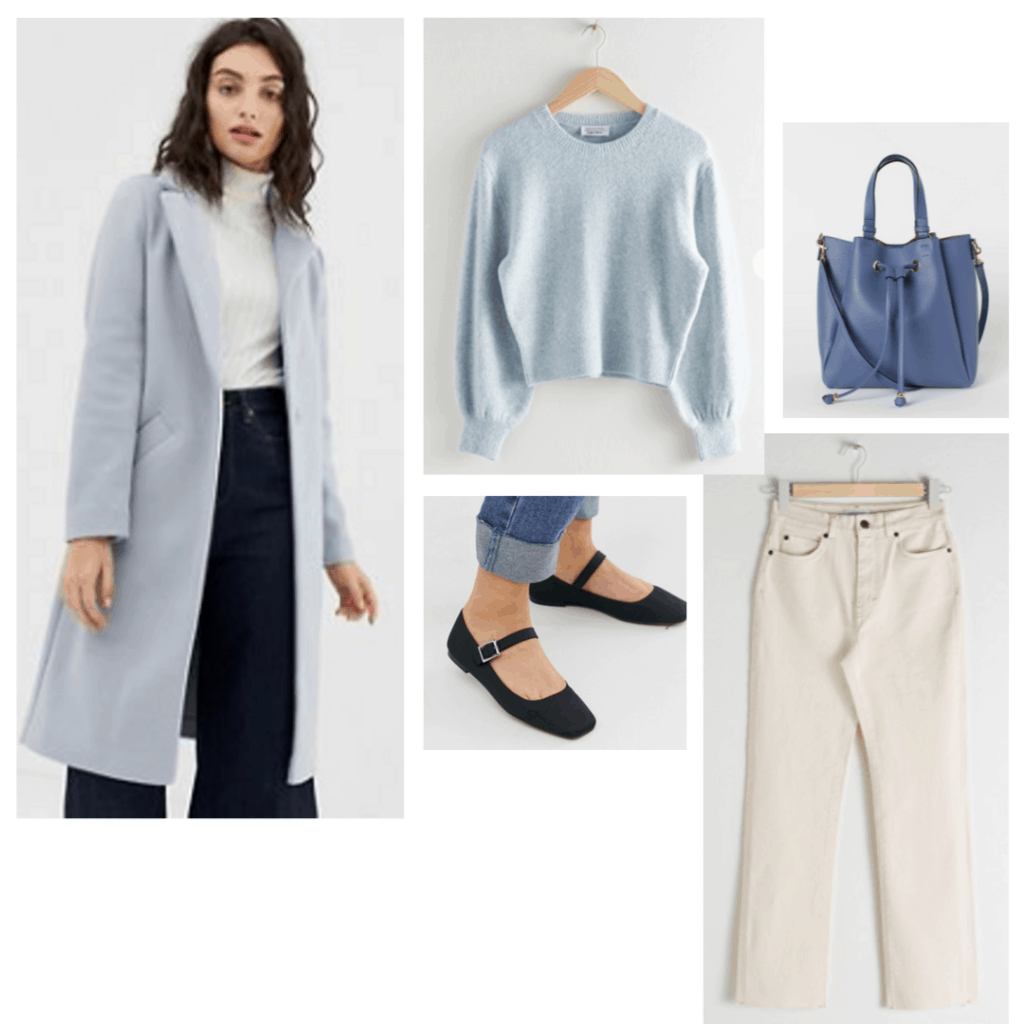 Rosemary's Baby fashion inspired outfit with blue sweater, light blue coat, beige pants, flats