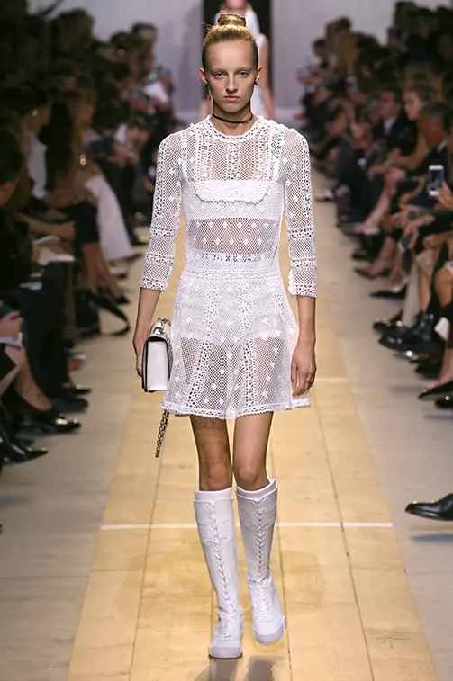 Christian Dior Spring 2017 runway look 1: White crochet cotton knit dress with white underwear and a white purse