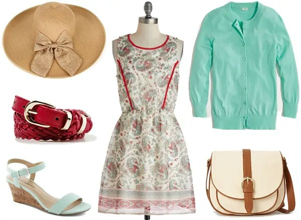 Inspired by Scarlett’s home, Tara, this outfit is a stylish choice for a day spent strolling through the local farmer’s market! Wear a pretty paisley-print dress paired with mint sandals and a matching cardigan. Add a red woven belt for a pop of color, and grab a saddle crossbody bag to store the essentials. Complete the look with a giant floppy sunhat with a bow – the perfect accessory for any southern belle!
