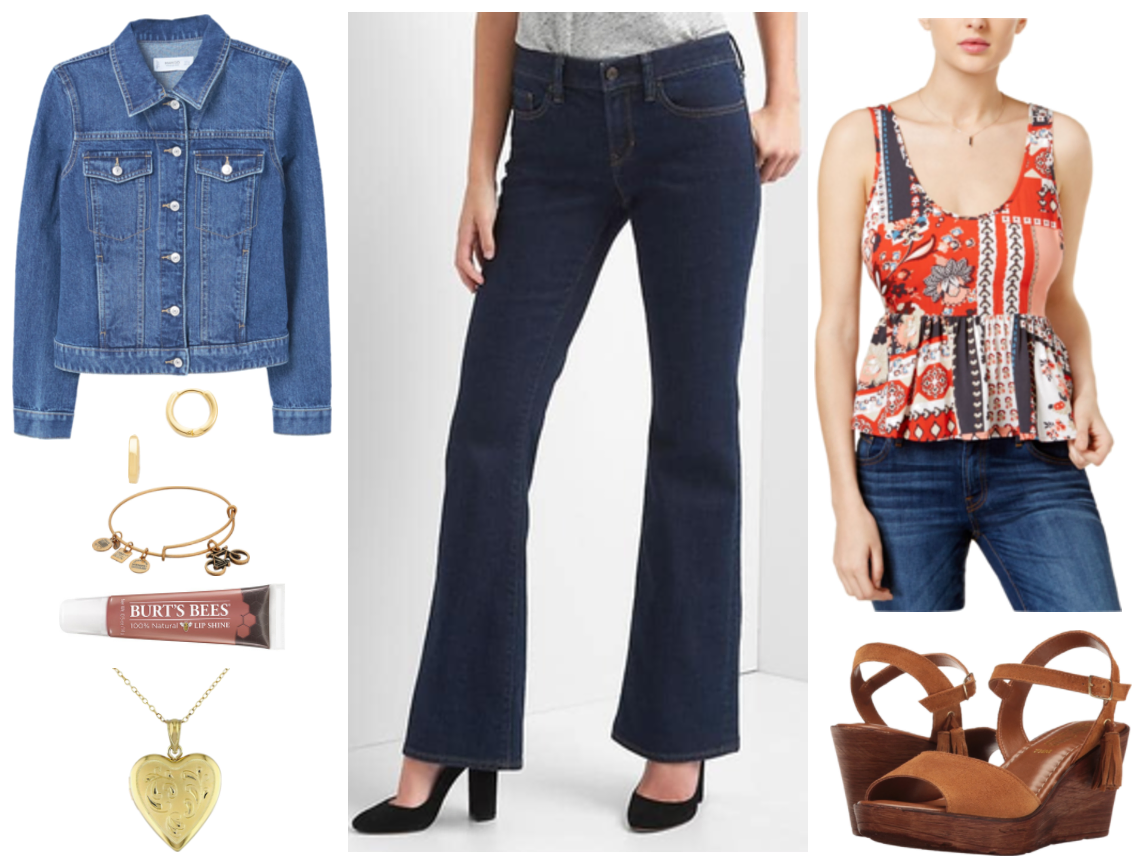 Products: Denim Jacket – Mango, Earrings – Shopbop, Bangle – Zappos, Lip Gloss – Burt’s Bees, Locket – Kohl’s, Jeans – Gap, Top – Macy’s, Wedges – Zappos