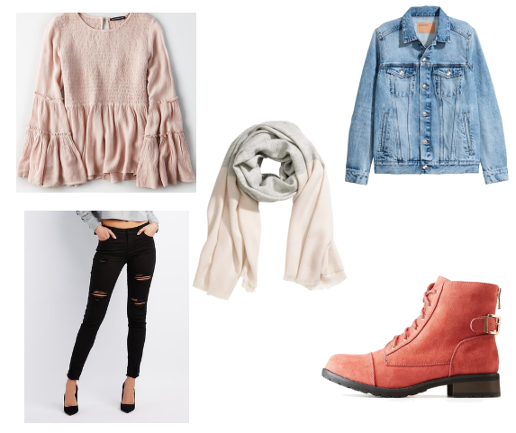 Products: Top – American Eagle Outfitters, Jeans – Charlotte Russe, Jacket – H&M, Boots – Charlotte Russe, Scarf – H&M