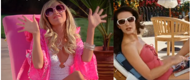 Sharpay looks ultra-glam as she wears a blingy white swimsuit, a pink studded kimono coverup, a star necklace, pink sunglasses, and sparkly bangles. Charlotte wears a rose pink lace-up swimsuit and white sunglasses for a grown-up feel.