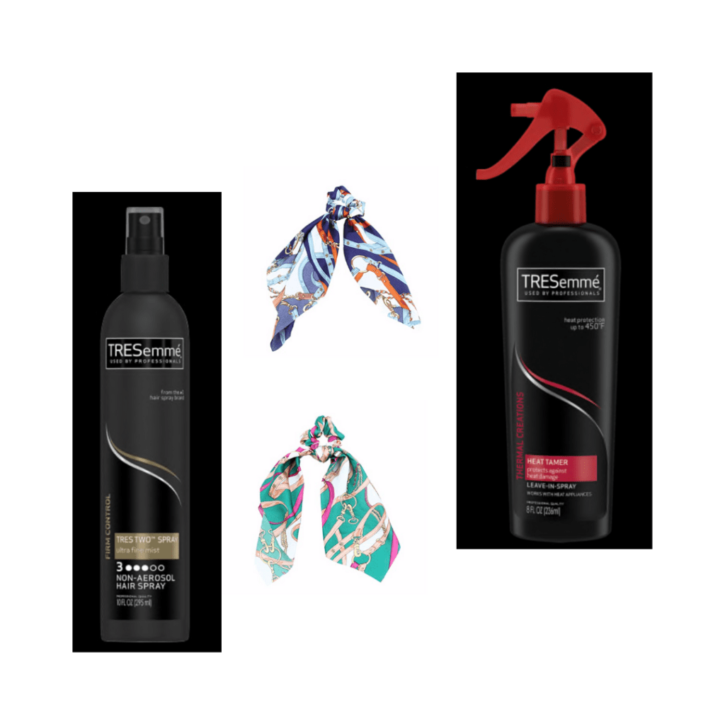 Products: Hair spray – Tresemmé, Heat protector – Tresemmé, Green hair tie – Amazon, Blue hair tie – Amazon