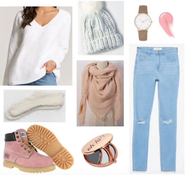Pink Timberland-esque boots come next to give a bit of contrast to the light blue of the hat. Wrap yourself up in a similarly hued pink scarf, too. Always stay on time with a rose gold and brown watch on your wrist, and use this super cute pocket mirror when you need to touch up your pearly pink lip gloss. So chic, so comfy.