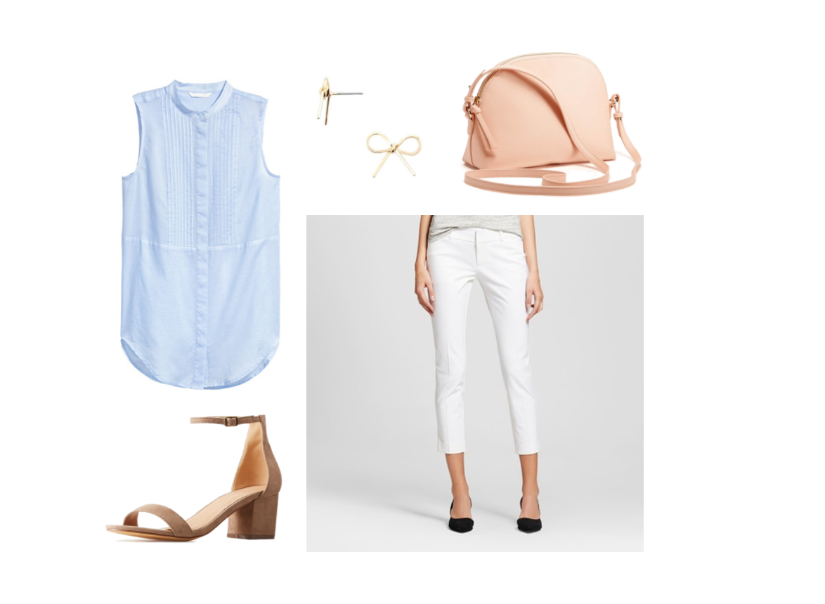 For this outfit, I chose a sleeveless blouse and cropped white pants and accessorized with simple, minimalist earrings, a rose-hued purse, and low-heeled sandals for a clean, dressy-casual look.