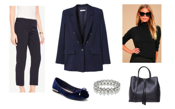 For today’s look, we’re going to pair our blazer with some navy pinstriped pants. Keeping with the navy theme, our shoes from Kohl’s match perfectly and have pretty gold details for interest. Our black turtleneck adds needed extra warmth and contrast to this otherwise navy-centric look. (Yes, you can wear black and navy together!)