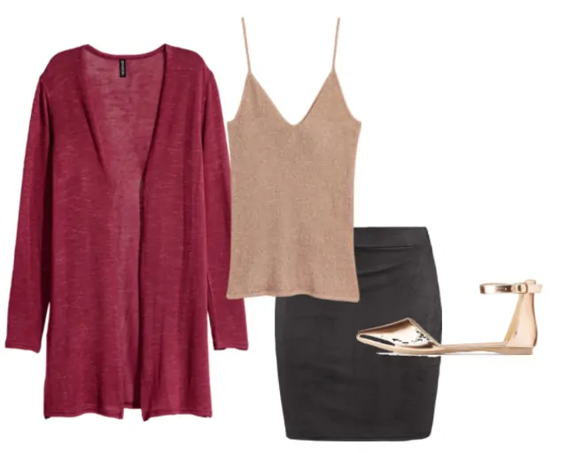 This style easy, comfortable, and, most importantly, chic: The cami and flats stand out and give a champagne twist to the dark red cardigan. Straightforward is still stylish.
