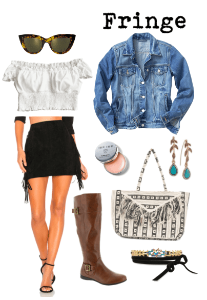 This fringe skirt gives off major western vibes- so it would work perfectly with your denim jacket and brown riding boots! A loose white blouse is cute without taking attention away from the trendy fringe skirt. If you can’t get enough fringe, add a fringe tote in a geometric print.